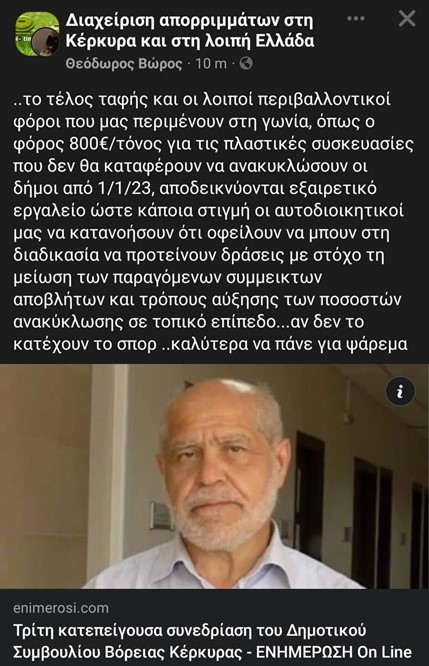 Το ευφυΐες της Κέρκυρας με την μεταφορά απορριμμάτων στο σύνολο των τριών Δήμων. Αυτά βέβαια αντιλαμβάνονται ορισμένοι, οι οποίοι, δεν μπαίνουν στον κόπο να μελετήσουν τις Ευρωπαϊκές Οδηγίες και τον Εθνικό Σχεδιασμό Διαχείρισης Απορριμμάτων. Αντίθετα, τα περιγελούν και θεωρούν εαυτούς ειδήμονες, στηρίζοντας την μεταφορά σε άλλο νησί ή νομό, έναντι των υποδομών και των έργων διαχείρισης που επιτύχαμε με το τελευταίο Νομοσχέδιο μέσω της διεύρυνσης του Φορέα.